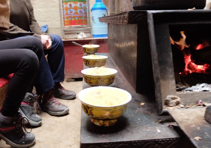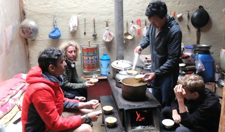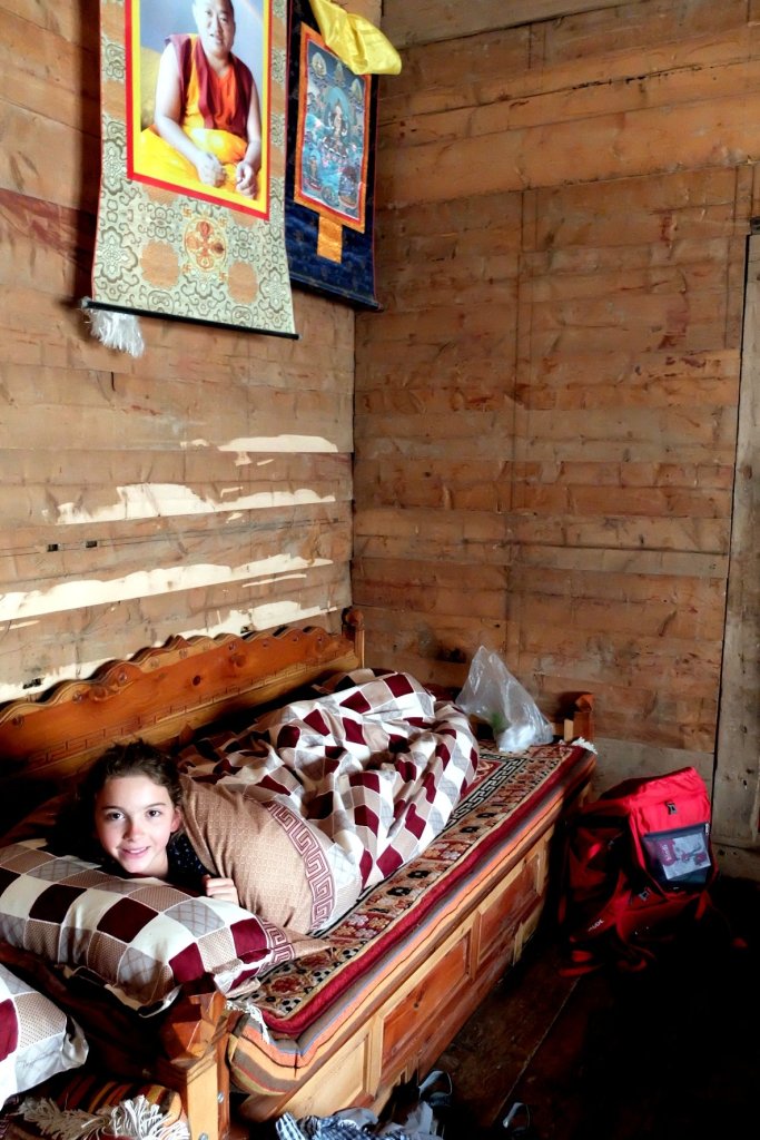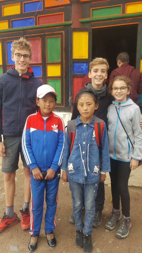 Wir lernen seine zwei kleinen Töchter, die sehr nett und lĂ€chelnd aber auch schĂŒchternd sind, und seine Stiefmutter kennen. Wir « reden » mit Zeichen und LĂ€cheln. Das lokale Leben ist sehr warmherzig und die Bewohner sind sehr nett und neugierig. Am letzten Tag besuchen wir auch Dorjees Mutter.