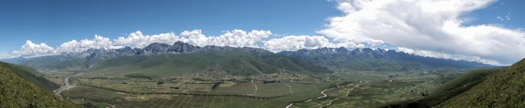 Nous quittons Ganze pour nous enfoncer dans le plateau tibĂ©tain en suivant la longue route G317. DĂ©filent d’un cĂŽtĂ© d’Ă©normes bosses vertes, de l’autre des barres rocheuses oĂč les sommets sont enneigĂ©s. Nous faisons halte pour rencontrer un groupe de femmes tibĂ©taines pique-niquant au bord de la route et nous joignons Ă leur danse. Certains d’entre nous, plus timides, se joignent simplement au Cercle, tandis que d’autres se lancent dans une dĂ©monstration de haut vol (voir photo).