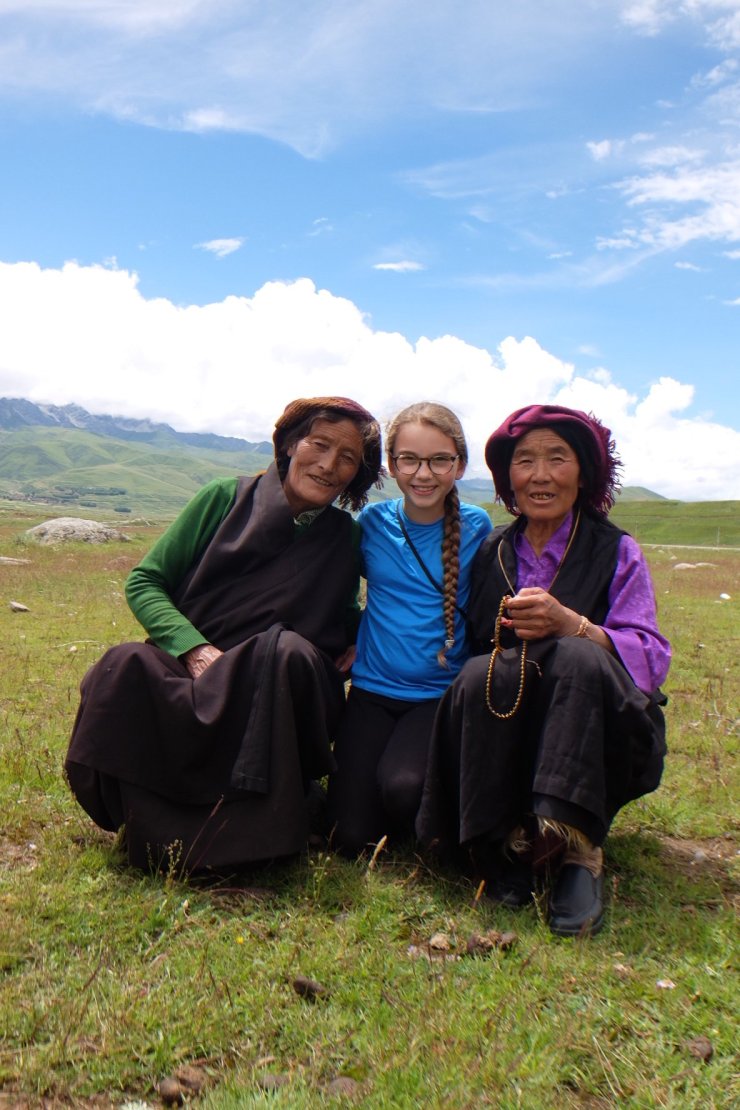 Wir verlassen die Stadt Ganze um uns weiter in Tibet fortzubewegen und folgen der langen Autostrecke G317. Wir fahren an riesigen grĂŒnen HĂŒgeln auf der einen und an steinigen Bergen mit beschneiten Spitzen auf der anderen Seite vorbei. Wir halten an, um eine Gruppe tibetischer Frauen kennenzulernen, die neben eine Autostrecke picknicken und tanzen mit ihnen. Manche von uns, die SchĂŒchteren, tanzen nur im Kreis, wĂ€hrend die andern einfach lostanzen (siehe Bild).