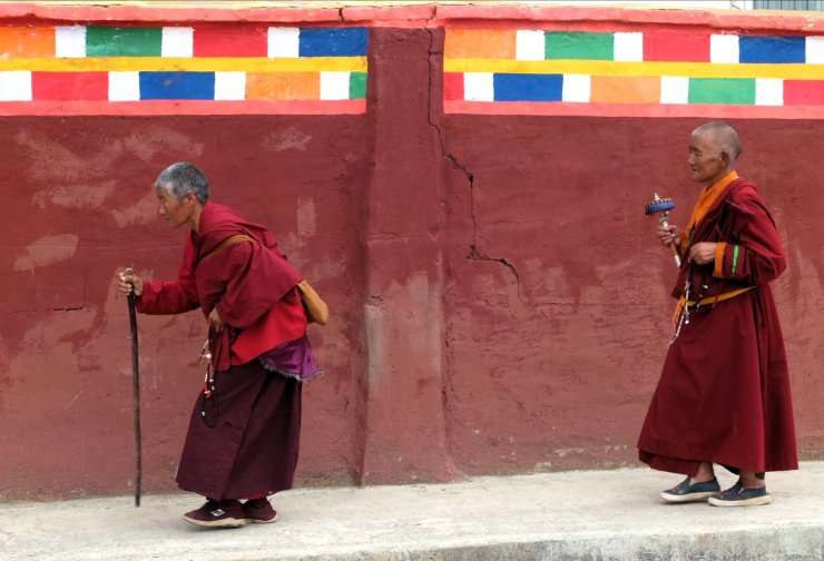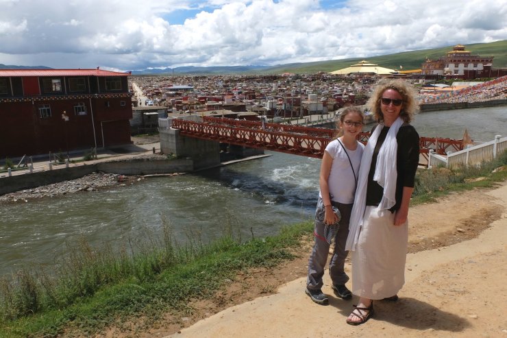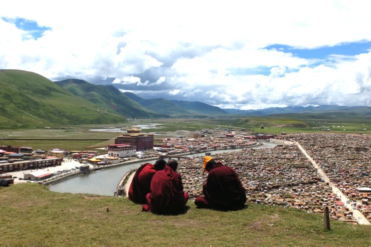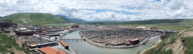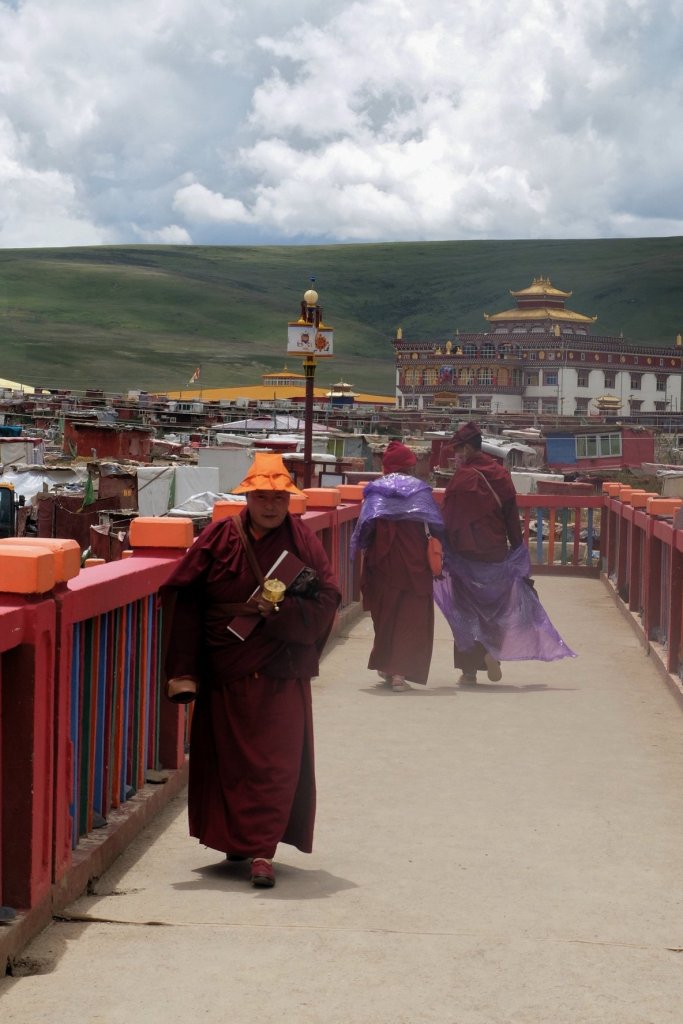 Nous dĂ©couvrons en contre-bas cette vĂ©ritable ville habitĂ©e par prĂšs de 10.000 de moines et nonnes. D’un cĂŽtĂ© du fleuve, la nonnerie, et son labyrinthe de petites habitations spartiates (cĂŽtĂ© droit de l’image). De l’autre, le monastĂšre. Les deux rives sont reliĂ©es par un pont, mais les Ă©changes se limitent au strict nĂ©cessaire logistique ou mĂ©dical.