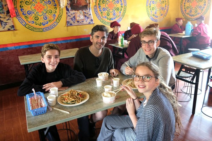 Nous dĂ©jeunons dans une sorte de rĂ©fectoire du cĂŽtĂ© des femmes, et retrouvons les soeurs de Dorjee et de notre chauffeur Uro, toutes deux nonnes ici. L’ambiance est trĂšs Ă©tonnante, bien loin de toute austĂ©ritĂ©. Une fois de plus, nous ne passons pas inaperçus, mais sommes toujours reçus avec gaitĂ© et spontanĂ©itĂ©. Les plus jeunes nonnes font plutĂŽt penser Ă  de bonnes copines au restaurant universitaire, et sont toutes Ă©quipĂ©es de smartphones ou ipad… Nous avons un peu de mal Ă  cerner la vie qui se dĂ©roule ici, entre retrait complet du monde et hyper-connection !