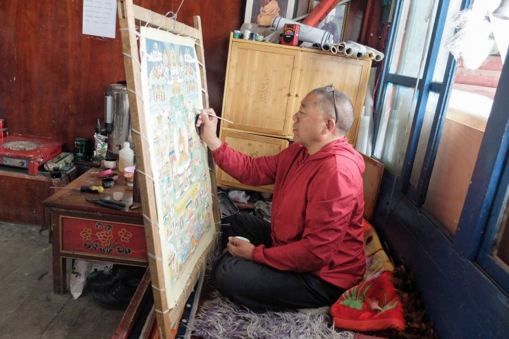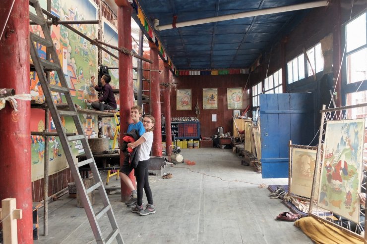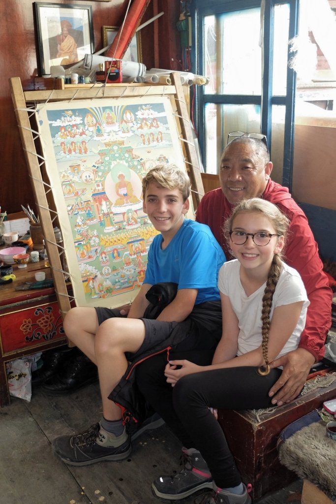 đ«đ· Dans un atelier de tangkas (voir ci-dessous) Ă Dzongsar, nous avons pu voir quelques artistes expĂ©rimentĂ©s peindre (dont le maĂźtre) mais la plupart Ă©taient des jeunes apprentis qui s’attaquaient Ă des tableaux moins complexes (enfin… c’Ă©tait quand mĂȘme hyper difficile !). Les Ă©lĂšves restent en moyenne 5 ans dans cet atelier-Ă©cole d’art. Je crois que je n’ai pas Ă vous faire un dessin, les tangkas aussi, bien sĂ»r, c’est pour les monastĂšres !