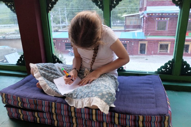 đ«đ· Ceux qui se souviennent de Dawa Drolmas savent que c’est elle qui nous a racontĂ© un tas de choses sur les statues. En fait, elle a aussi une guest-house ! Du coup, nous avons dormi lĂ . Ăa a Ă©tĂ© vraiment pratique parce qu’elle parle parfaitement anglais (elle a eu une bourse pour Ă©tudier Ă Harvard) et ça, ça fait plaisir. En fin de journĂ©e c’est dĂ©tente : tremper les pieds dans le fleuve, jouer de la musique, dessiner, jouer Ă la balle, Ă©crire pour le blog đ ou courir aprĂšs le bĂ©bĂ© yak de la famille !
