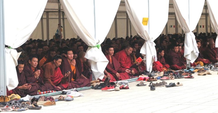 Nous arrivons Ă la fin d’une cĂ©rĂ©monie, reservĂ©e aux moines et nonnes, et sommes marquĂ©s par les visages fermĂ©s de centaines de nonnes que nous croisons quittant le temple, et qui tranchent avec les habituels sourires et interpellations enjouĂ©es des nombreux religieux que nous croisons… mystĂšre.