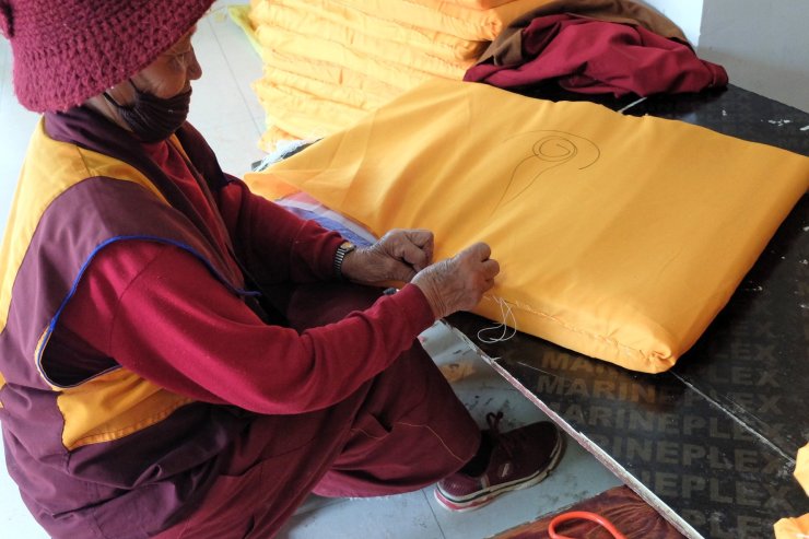 Nous dĂ©couvrons aussi ce qui se cache dans le ventre des moulins Ă priĂšres… des centaines de feuillets de mantras (phrases sacrĂ©es), cousus dans ces enveloppes de tissus orange, seront mises en mouvement par les fidĂšles. TrĂ©s beau rituel alliant la priĂšre au mouvement !
