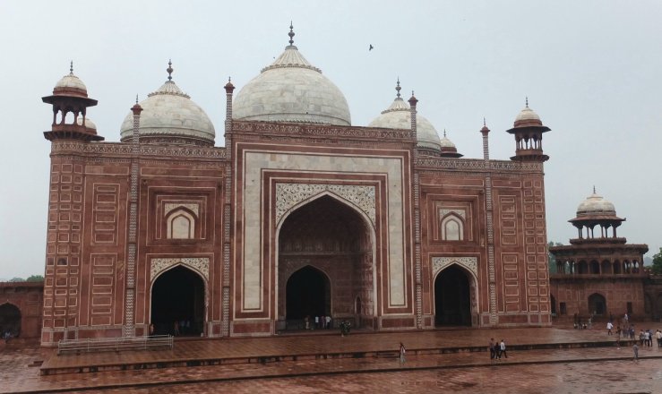 đ«đ· De chaque cĂŽtĂ© du Taj Mahal on pouvait voir deux mosquĂ©es identiques, majoritairement rouges quant Ă elles, mais aussi surmontĂ©es de domes de mabre blanc. Commme sur beaucoup d’autres bĂątiments les singes sont prĂ©sents, il y en a mĂȘme qui ont un peu attaquĂ© des personnes et leur ont volĂ© de la nourriture.